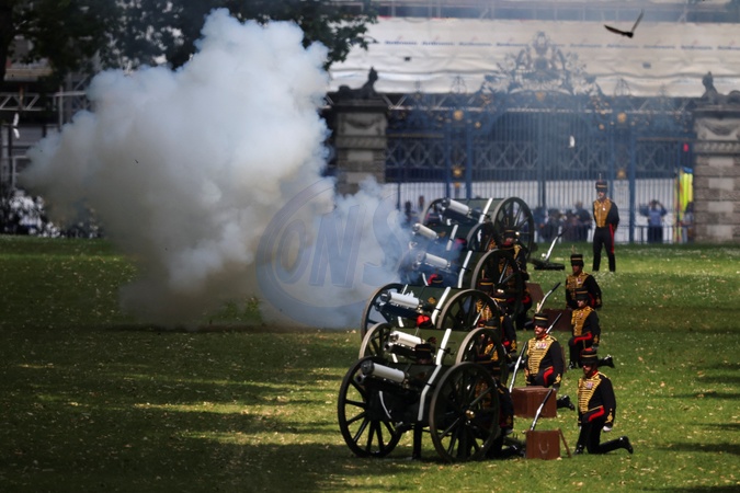 Cérémonie d'accueil et trajet en calèche lors de la visite de l'empereur Naruhito du Japon à Londres le 25 juin 2024. © Photoshot / Panoramic / Bestimage A gun salute is fired on the day of Japan's Emperor Naruhito and Empress Masako's state visit, in London, Britain, June 25, 2024., Credit:Isabel Infantes / Avalon Cérémonie d'accueil pour la visite d'État de l'empereur et de l'impératrice du Japon - Horse Guards Parade - Londres