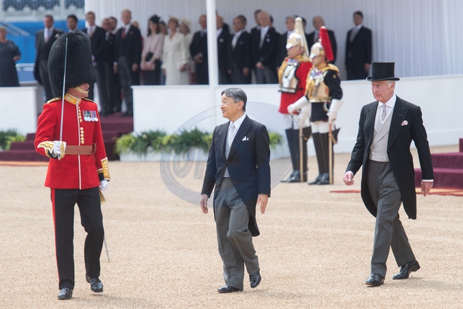 Le roi Charles III d'Angleterre et L'empereur du Japon Naruhito - Cérémonie d'accueil et trajet en calèche lors de la visite de l'empereur Naruhito du Japon à Londres le 25 juin 2024. © Photoshot / Panoramic / Bestimage King Charles III and Emperor Naruhito of Japan inspect the Guard of Honour at a Ceremonial Welcome for the State Visit by The Emperor and Empress of Japan at Horse Guards Parade in London, England, UK on Tuesday 25 June, 2024., Cérémonie d'accueil pour la visite d'État de l'empereur et de l'impératrice du Japon - Horse Guards Parade - Londres