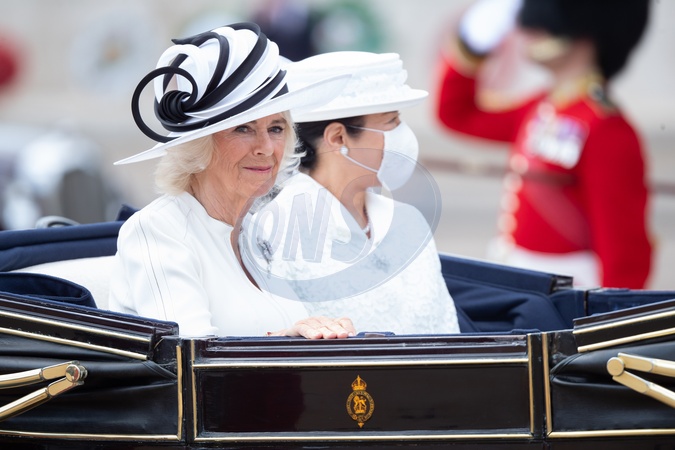 la reine consort Camilla et l'impératrice Masako du Japon - Cérémonie d'accueil et trajet en calèche lors de la visite de l'empereur Naruhito du Japon à Londres le 25 juin 2024. © Photoshot / Panoramic / Bestimage Queen Camilla and Empress Masako of Japan depart the Ceremonial Welcome for the State Visit by The Emperor and Empress of Japan at Horse Guards Parade in London, England, UK on Tuesday 25 June, 2024., Cérémonie d'accueil pour la visite d'État de l'empereur et de l'impératrice du Japon - Horse Guards Parade - Londres