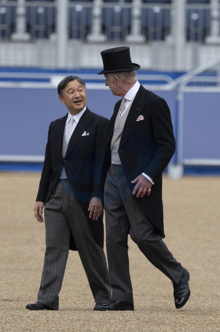 Le roi Charles III d'Angleterre et L'empereur du Japon Naruhito - Cérémonie d'accueil et trajet en calèche lors de la visite de l'empereur Naruhito du Japon à Londres le 25 juin 2024. © Photoshot / Panoramic / Bestimage Horse Guards Parade, London, UK. 25th June 2024. Ceremonial welcome of Japanese Emperor Naruhito and Empress Masako on their State Visit to the UK. They are accompanied to the Royal Pavilion on Horse Guards by His Royal Highness The Prince of Wales. After the Guard of Honour give the Royal Salute and play the Japanese National Anthem, the Emperor and King Charles III inspect the Guard of Honour from the 1st Battalion Welsh Guards with the Band of the Welsh Guards. The Emperor and Empress then join The King and Queen, and The Prince of Wales, in a carriage procèssion along The Mall to Buckingham Palace., Cérémonie d'accueil pour la visite d'État de l'empereur et de l'impératrice du Japon - Horse Guards Parade - Londres