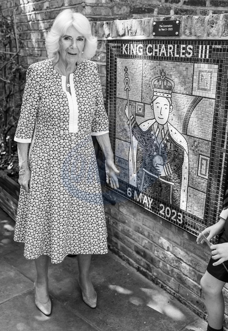 (EDITORS NOTE: This image has been converted to black and white.) Queen Camilla poses with a ceramic tiled mural celebrating the coronation of King Charles III in the school's garden during her visit to Christ Church C of E Primary School's Literary Festival on June 26, 2024 in London, England. NO UK USE FOR 48 HOURS, Credit:Avalon.red / Avalon