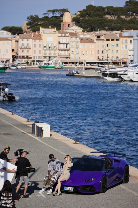 Exclusif - Le rappeur Tyga tourne un clip sur le port de Saint-Tropez avec pour partenaire, une Lamborghini Huracán EVO Spyder le 26 juin 2024. Rapper Tyga shoots a video on the port of Saint-Tropez with a Lamborghini Huracán EVO Spyder as his partner on 26 June 2024.