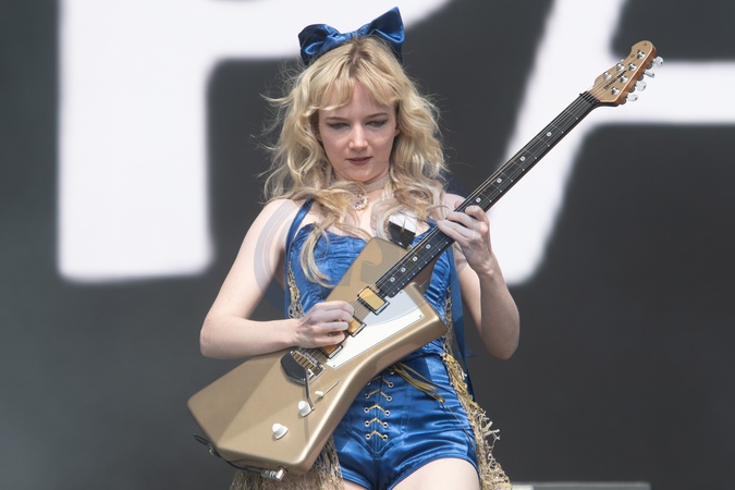 Lead guitarist Emily Roberts of English indie band The Last Dinner Party performs on the Other Stage at Glastonbury Festival 2024 Saturday at Worthy Farm, Pilton in Glastonbury, England, UK on Saturday 29 June 2024., Credit:Justin Ng / Avalon