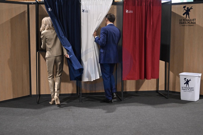 Prezydent Republiki Emmanuelle Macron i jego żona, Pierwsza Dama Brigitte Macron, głosują w pierwszej turze wyborów legislacyjnych w Salle des Quatre Saisons w Le Touquet