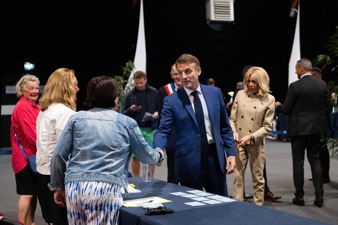 Prezydent Republiki Emmanuel Macron i jego żona, Pierwsza Dama Brigitte Macron, głosują w pierwszej turze wyborów legislacyjnych w Salle des Quatre Saisons w Le Touquet
