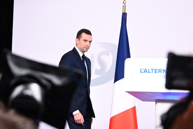 Jordan Bardella wygłasza przemówienie podczas wieczoru wyników pierwszej tury wyborów do organów legislacyjnych w Paryżu