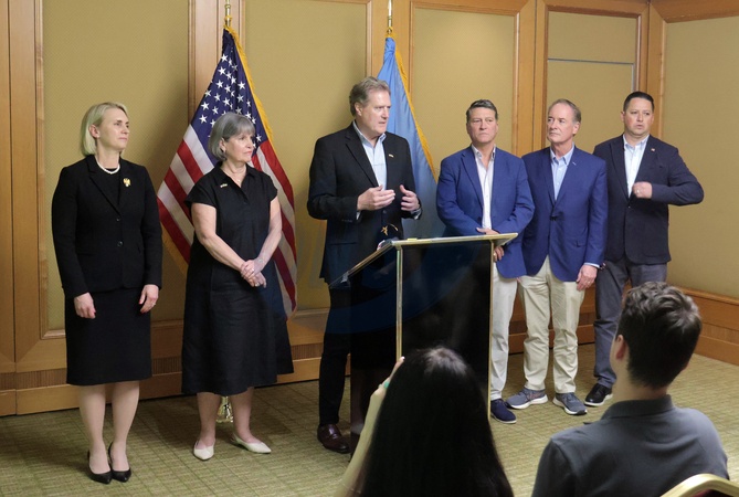 KYIV, UKRAINE - JULY 1, 2024 - US Ambassador to Ukraine Bridget A. Brink, US Congresswoman Betty McCollum, Chairman of the House Permanent Select Committee on Intelligence Mike Turner, US Congressmen Ronny Jackson, John Joyce and Tony Gonzales (L to R) attend a briefing during the visit of the bipartisan delegation from the US House of Representatives, Kyiv, capital of Ukraine., Credit:Eugen Kotenko / Avalon