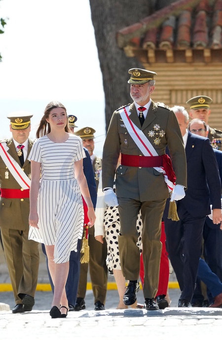 Król Felipe VI i królowa Hiszpanii Letizia oraz księżniczka Leonor podczas ceremonii wręczenia medali dla nowej klasy podoficerów Armii i Gwardii Cywilnej w Saragossie