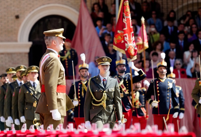 Le roi Felipe VI et la reine Letizia d’Espagne, et la princesse Leonor, lors de la cérémonie de remise des médailles à la nouvelle classe des sous-officiers de l'armée et de la Garde civile à Zaragoza