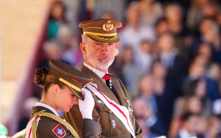 Le roi Felipe VI et la reine Letizia d’Espagne, et la princesse Leonor, lors de la cérémonie de remise des médailles à la nouvelle classe des sous-officiers de l'armée et de la Garde civile à Zaragoza