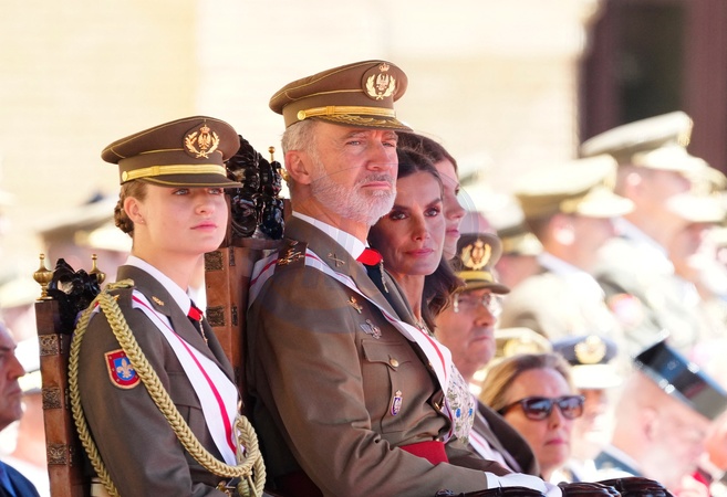 Le roi Felipe VI et la reine Letizia d’Espagne, et la princesse Leonor, lors de la cérémonie de remise des médailles à la nouvelle classe des sous-officiers de l'armée et de la Garde civile à Zaragoza