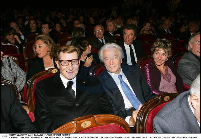 Rétro - Décès de Roland Dumas - "YVES SAINT LAURENT" ET "ROLAND DUMAS" - GENERALE DE LA PIECE DE THEATRE "LES MONTAGNES RUSSES" AVEC "ALAIN DELON" ET "ASTRID VEILLON" AU THEATRE MARIGNY A PARIS HOMME STYLISTE CREATEUR ASSIS "PLAN SERRE" LUNTETTES