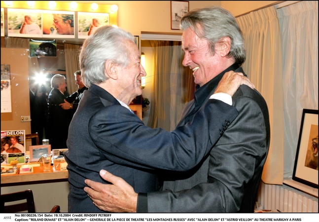 Rétro - Décès de Roland Dumas - Info - Roland Dumas fête ses 100 ans le 23 août - "ROLAND DUMAS" ET "ALAIN DELON" - GENERALE DE LA PIECE DE THEATRE "LES MONTAGNES RUSSES" AVEC "ALAIN DELON" ET "ASTRID VEILLON" AU THEATRE MARIGNY A PARIS HOMME COMEDIEN ACTEUR "PLAN AMERICAIN"