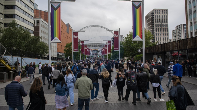 AC/DC performing live at Wembley Stadium, London on 3 July 2024Fans walking up to Wembley Stadium.AC/DC are an Australian rock band formed in '73. It was founded by the Young brothers.Their music has been variously described as hard rock, blues rock and heavy metal, but the band calls it simply "rock and roll". They are cited as a formative influence on the new wave of British heavy metal bands. AC/DC were inducted into the Rock and Roll Hall of Fame in '03.This is their Power up tour (styled PWR/UP Tour) for their seventeenth studio album Power Up, released '20., Credit:Dafydd Owen / Avalon