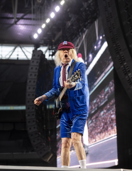 AC/DC performing live at Wembley Stadium, London on 3 July 2024Angus Young ,lead guitaristAC/DC are an Australian rock band formed in '73. It was founded by the Young brothers.Their music has been variously described as hard rock, blues rock and heavy metal, but the band calls it simply "rock and roll". They are cited as a formative influence on the new wave of British heavy metal bands. AC/DC were inducted into the Rock and Roll Hall of Fame in '03.This is their Power up tour (styled PWR/UP Tour) for their seventeenth studio album Power Up, released '20., Credit:Dafydd Owen / Avalon