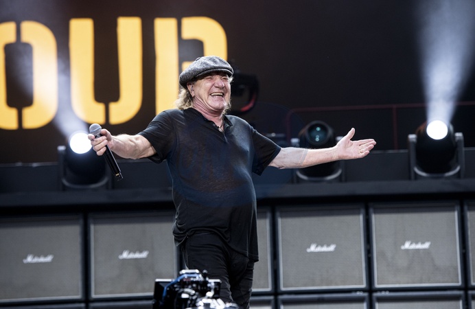 AC/DC performing live at Wembley Stadium, London on 3 July 2024Brian Johnson ,lead singerAC/DC are an Australian rock band formed in '73. It was founded by the Young brothers.Their music has been variously described as hard rock, blues rock and heavy metal, but the band calls it simply "rock and roll". They are cited as a formative influence on the new wave of British heavy metal bands. AC/DC were inducted into the Rock and Roll Hall of Fame in '03.This is their Power up tour (styled PWR/UP Tour) for their seventeenth studio album Power Up, released '20., Credit:Dafydd Owen / Avalon