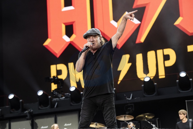 AC/DC performing live at Wembley Stadium, London on 3 July 2024Brian Johnson ,lead singerAC/DC are an Australian rock band formed in '73. It was founded by the Young brothers.Their music has been variously described as hard rock, blues rock and heavy metal, but the band calls it simply "rock and roll". They are cited as a formative influence on the new wave of British heavy metal bands. AC/DC were inducted into the Rock and Roll Hall of Fame in '03.This is their Power up tour (styled PWR/UP Tour) for their seventeenth studio album Power Up, released '20., Credit:Dafydd Owen / Avalon