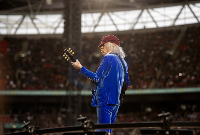 AC/DC performing live at Wembley Stadium, London on 3 July 2024Angus Young ,lead guitaristAC/DC are an Australian rock band formed in '73. It was founded by the Young brothers.Their music has been variously described as hard rock, blues rock and heavy metal, but the band calls it simply "rock and roll". They are cited as a formative influence on the new wave of British heavy metal bands. AC/DC were inducted into the Rock and Roll Hall of Fame in '03.This is their Power up tour (styled PWR/UP Tour) for their seventeenth studio album Power Up, released '20., Credit:Dafydd Owen / Avalon