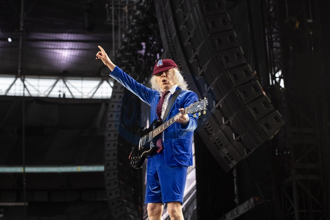 AC/DC performing live at Wembley Stadium, London on 3 July 2024Angus Young ,lead guitaristAC/DC are an Australian rock band formed in '73. It was founded by the Young brothers.Their music has been variously described as hard rock, blues rock and heavy metal, but the band calls it simply "rock and roll". They are cited as a formative influence on the new wave of British heavy metal bands. AC/DC were inducted into the Rock and Roll Hall of Fame in '03.This is their Power up tour (styled PWR/UP Tour) for their seventeenth studio album Power Up, released '20., Credit:Dafydd Owen / Avalon