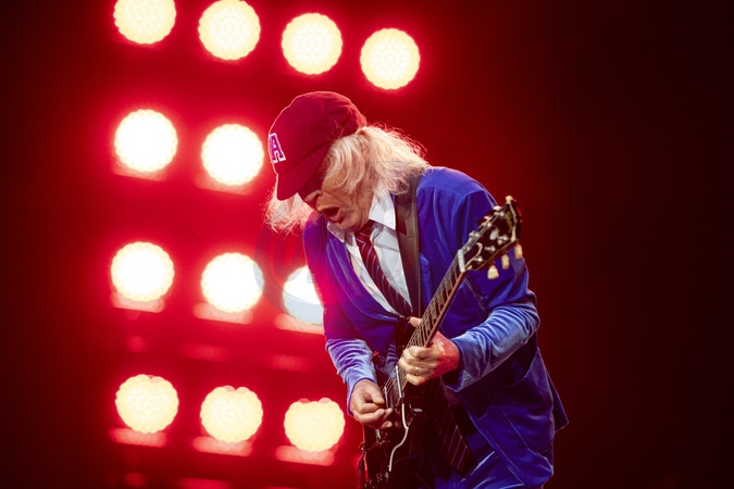 AC/DC performing live at Wembley Stadium, London on 3 July 2024Angus Young ,lead guitaristAC/DC are an Australian rock band formed in '73. It was founded by the Young brothers.Their music has been variously described as hard rock, blues rock and heavy metal, but the band calls it simply "rock and roll". They are cited as a formative influence on the new wave of British heavy metal bands. AC/DC were inducted into the Rock and Roll Hall of Fame in '03.This is their Power up tour (styled PWR/UP Tour) for their seventeenth studio album Power Up, released '20., Credit:Dafydd Owen / Avalon