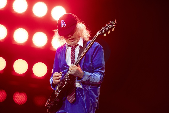 AC/DC performing live at Wembley Stadium, London on 3 July 2024Angus Young ,lead guitaristAC/DC are an Australian rock band formed in '73. It was founded by the Young brothers.Their music has been variously described as hard rock, blues rock and heavy metal, but the band calls it simply "rock and roll". They are cited as a formative influence on the new wave of British heavy metal bands. AC/DC were inducted into the Rock and Roll Hall of Fame in '03.This is their Power up tour (styled PWR/UP Tour) for their seventeenth studio album Power Up, released '20., Credit:Dafydd Owen / Avalon