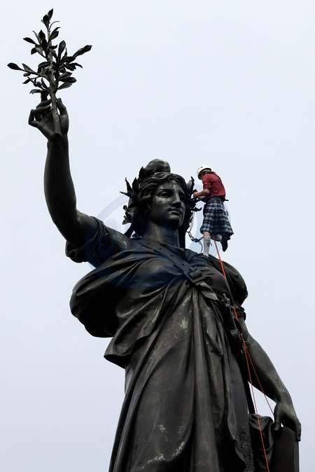Un manifestant escalade la statue de la place de la République pour y installer unne banderolle lors d'un rassemblement contre l'extrême droite, place de la République à Paris, le 3 juillet 2024, Paris, le 3 juillet 2024 © Stéphane Lemouton / Bestimage Rally against the far right at Place de la République in Paris four days before the second round of legislative elections on july 3rd 2024