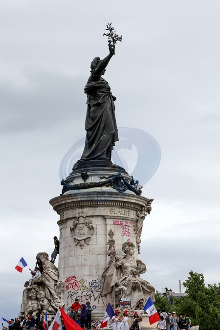 Des manifestants participent à un rassemblement contre l'extrême droite, place de la République à Paris, le 3 juillet 2024, Paris, le 3 juillet 2024 © Stéphane Lemouton / Bestimage Rally against the far right at Place de la République in Paris four days before the second round of legislative elections on july 3rd 2024