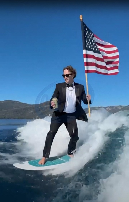 Mark Zuckerberg surfe en costume, une bière et un drapeau américain dans les mains Fesseà l’occasion des festivités du 4 juillet
