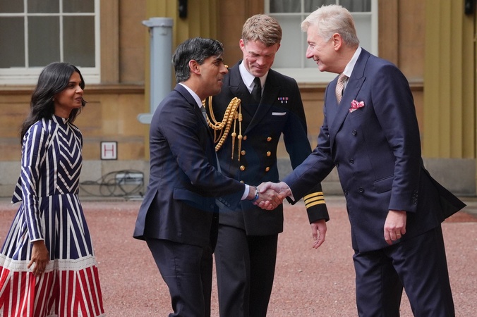 Sir Clive Alderton, Principal Private Secretary to The King and Queen(right) with Commander William Thornton, Royal Navy, Equerry to The King (2nd right) greet Rishi Sunak and his wife Akshata Murty, as he arrives at Buckingham Palace for an audience with King Charles III to formally resign as PM following the landslide General Election victory for the Labour Party. Picture date: Friday July 5, 2024. Election. NO UK USE FOR 48 HOURS, Credit:Avalon.red / Avalon