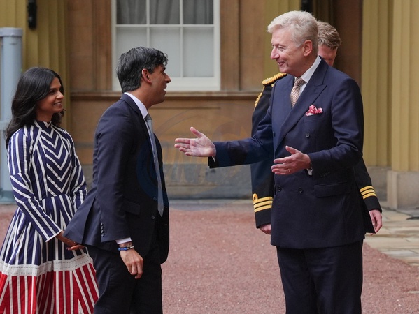 Sir Clive Alderton, Principal Private Secretary to The King and Queen(right) with Commander William Thornton, Royal Navy, Equerry to The King (hidden) greet Rishi Sunak and his wife Akshata Murty, as he arrives at Buckingham Palace for an audience with King Charles III to formally resign as PM following the landslide General Election victory for the Labour Party. Picture date: Friday July 5, 2024. Election. NO UK USE FOR 48 HOURS, Credit:Avalon.red / Avalon
