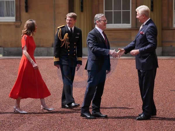 Sir Clive Alderton, Principal Private Secretary to the King and Queen (right) with Commander William Thornton, Royal Navy, Equerry to the King (2nd left) greet Sir Keir Starmer, and his wife Victoria Starmer, as he arrives at Buckingham Palace in London for an audience with King Charles III, where he will be invited to become Prime Minister and form a new government, following the landslide General Election victory for the Labour Party. Picture date: Friday July 5, 2024. NO UK USE FOR 48 HOURS, Credit:Avalon.red / Avalon
