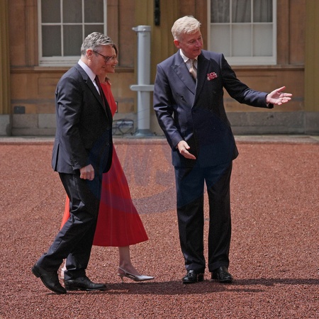 Sir Clive Alderton, Principal Private Secretary to the King and Queen (right) greets Sir Keir Starmer, and his wife Victoria Starmer, as he arrives at Buckingham Palace in London for an audience with King Charles III, where he will be invited to become Prime Minister and form a new government, following the landslide General Election victory for the Labour Party. Picture date: Friday July 5, 2024. NO UK USE FOR 48 HOURS, Credit:Avalon.red / Avalon