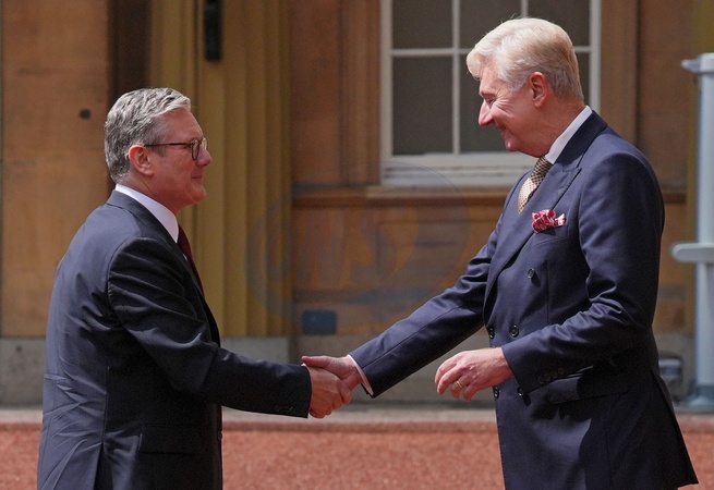 Sir Clive Alderton, Principal Private Secretary to the King and Queen (right) greets Sir Keir Starmer as he arrives at Buckingham Palace in London for an audience with King Charles III, where he will be invited to become Prime Minister and form a new government, following the landslide General Election victory for the Labour Party. Picture date: Friday July 5, 2024. NO UK USE FOR 48 HOURS, Credit:Avalon.red / Avalon