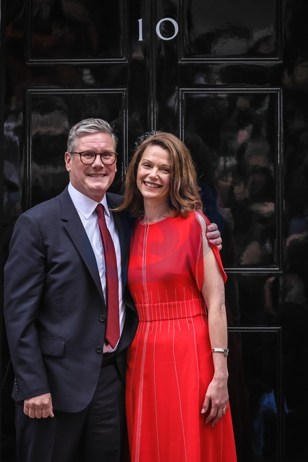 London, UK. 05th July, 2024. Sir Keir Starmer, Leader of the Labour Party, holds his first speech as Prime Minister of the United Kingdom in Downing Street after Labour won the general election. He walks up Downing Street with his wife Victoria (in red dress), greeting Labour MPS and guests, then holds his speech, and finally poses with his wife by the No 10 Downing Street Door., Credit:Imageplotter / Avalon