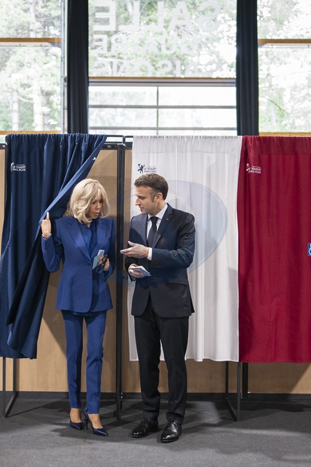 Emmanuel Macron, Prezydent Republiki Francuskiej i Pierwsza Dama Brigitte Macron, głosują za drugą turą wyborów legislacyjnych w Le Touquet”