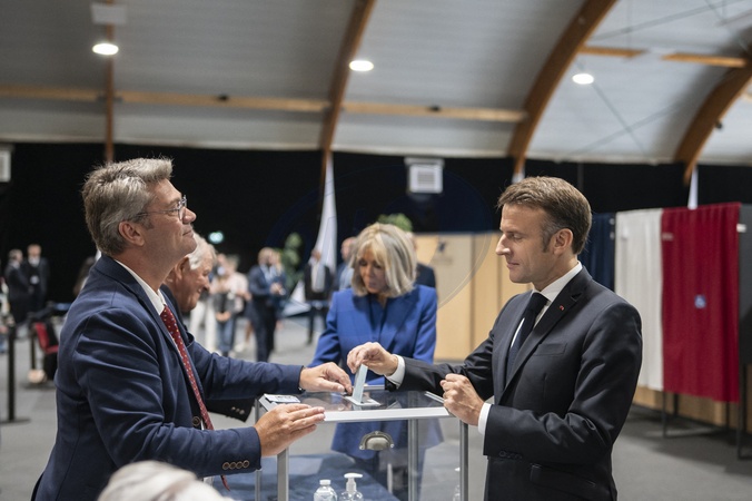 Emmanuel Macron, Prezydent Republiki Francuskiej i Pierwsza Dama Brigitte Macron, głosują za drugą turą wyborów legislacyjnych w Le Touquet”
