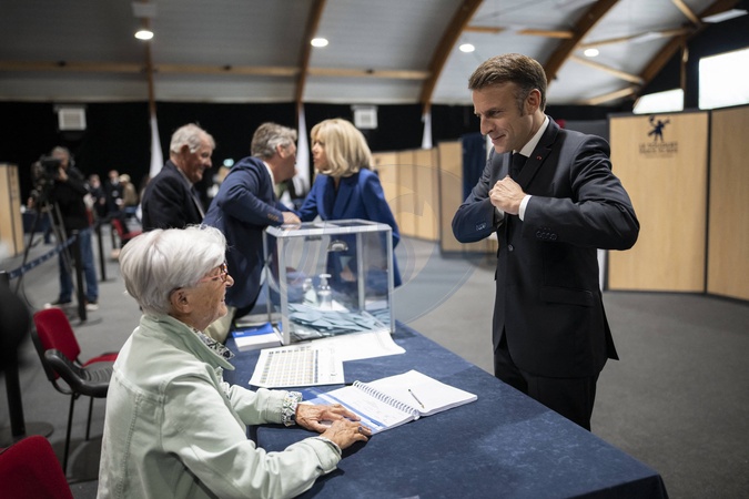 Emmanuel Macron, Prezydent Republiki Francuskiej i Pierwsza Dama Brigitte Macron, głosują za drugą turą wyborów legislacyjnych w Le Touquet”
