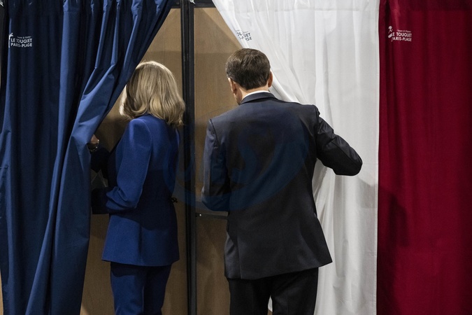 Emmanuel Macron, Prezydent Republiki Francuskiej i Pierwsza Dama Brigitte Macron, głosują za drugą turą wyborów legislacyjnych w Le Touquet”