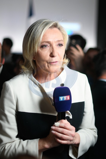 Marine Le Pen lors de la soirée électorale du Rassemblement National lors du second tour des élections législatives au Parc Floral à Paris le 7 juillet 2024. Marine Le Pen during the election night of the National Rally during the second round of the legislative elections at the Parc Floral in Paris on July 7, 2024.