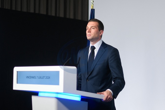 Jordan Bardella lors de la soirée électorale du Rassemblement National lors du second tour des élections législatives au Parc Floral à Paris