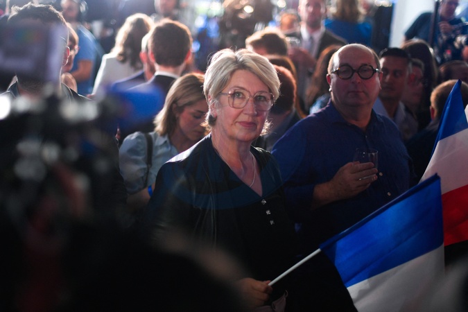 Jordan Bardella podczas wieczoru wyborczego Zgromadzenia Narodowego podczas drugiej tury wyborów legislacyjnych w Parc Floral w Paryżu