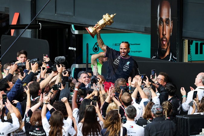 HAMILTON Lewis (gbr), Mercedes AMG F1 Team W15, celebrating victory, during the Formula 1 Qatar Airways British Grand Prix 2024, 12th round of the 2024 Formula One World Championship from July 5 to 7, 2024 on the Silverstone Circuit, in Silverstone, United Kingdom -