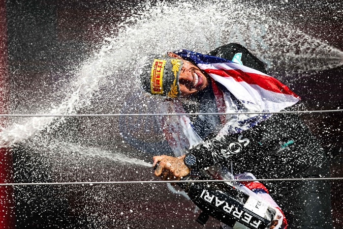 HAMILTON Lewis (gbr), Mercedes AMG F1 Team W15, portrait celebration podium with Ferrari champagne during the Formula 1 Qatar Airways British Grand Prix 2024, 12th round of the 2024 Formula One World Championship from July 5 to 7, 2024 on the Silverstone Circuit, in Silverstone, United Kingdom -