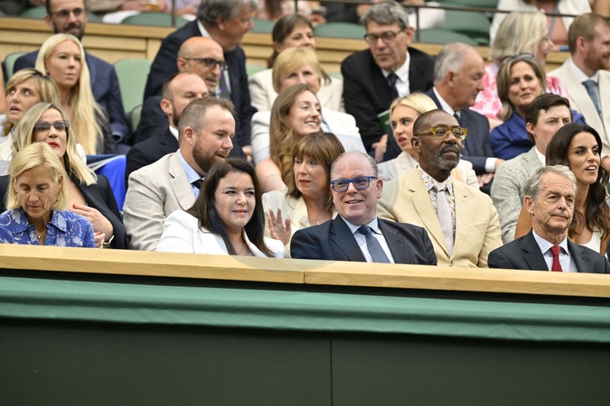 Madame Melanie Antoinette de Massy, prezes Monte-Carlo Country Club i książę Monako ALbert II w Royal Box na turnieju Wimbledon w Londynie