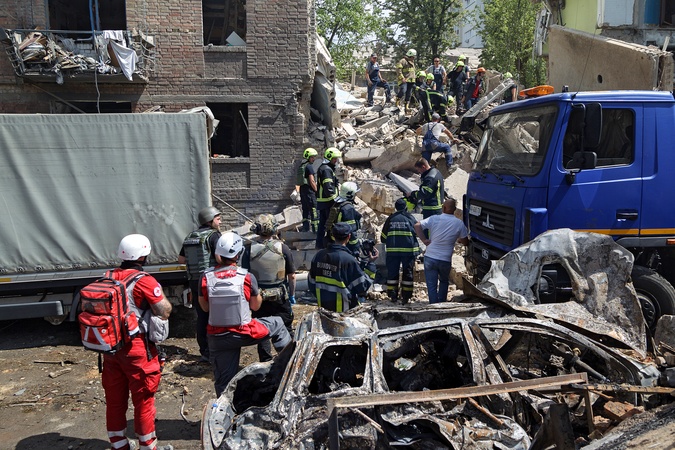 KYIV, UKRAINE - JULY 8, 2024 - Rescuer workers remove the rubble at a section of a five-storey apartment building in the Shevchenkivskyi district ruined by the Russian missile attack, Kyiv, capital of Ukraine., Credit:Kirill Chubotin / Avalon