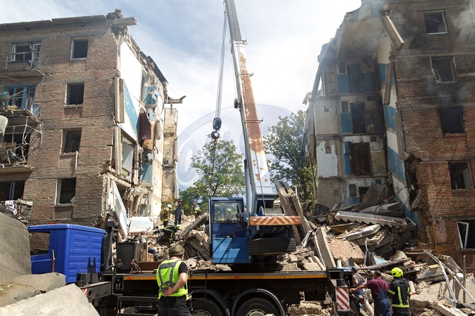 KYIV, UKRAINE - JULY 8, 2024 - Rescuer workers remove the rubble at a section of a five-storey apartment building in the Shevchenkivskyi district ruined by the Russian missile attack, Kyiv, capital of Ukraine., Credit:Kirill Chubotin / Avalon