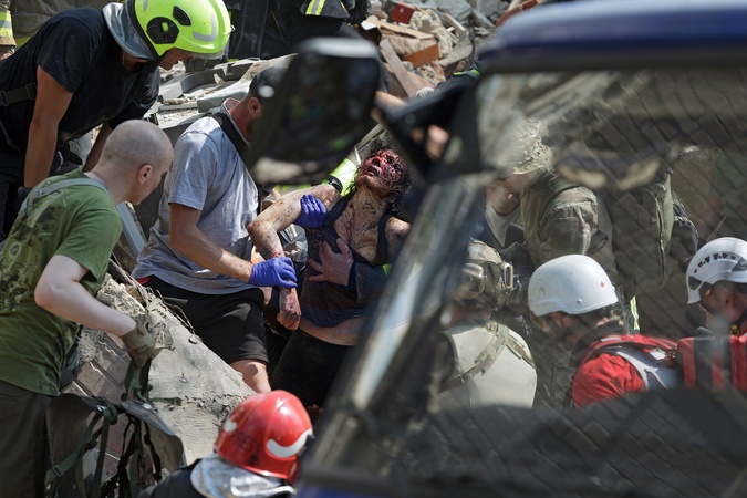 KYIV, UKRAINE - JULY 8, 2024 - Rescuer workers and volunteers free a woman found under the rubble of a section of a five-storey apartment building in the Shevchenkivskyi district ruined by the Russian missile attack, Kyiv, capital of Ukraine., Credit:Kirill Chubotin / Avalon
