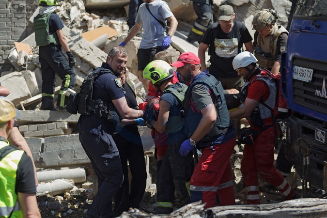 KYIV, UKRAINE - JULY 8, 2024 - Paramedics carry a woman found under the rubble of a section of a five-storey apartment building in the Shevchenkivskyi district ruined by the Russian missile attack, Kyiv, capital of Ukraine., Credit:Kirill Chubotin / Avalon