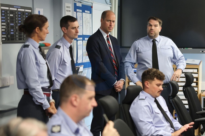 HOLYHEAD, UNITED KINGDOM - JULY 09: Prince William, Prince of Wales talks to base personnel inside the Air Traffic Control Tower during an official visit at RAF Valley on July 09, 2024 in Holyhead, United Kingdom. The Price of Wales spent three years stationed at RAF Valley whilst serving as an RAF Search and Rescue pilot between 2010 and 2013., Credit:Chris Jackson / Avalon