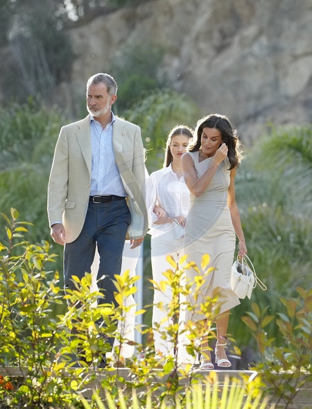 Le roi Felipe VI d'Espagne, la reine Letizia, la princesse héritière Leonor et l'infante Sofia arrivant à l'hôtel Melia Lloret de Mar pour une réception en l'honneur des lauréats du prix Princesse de Gérone (Princess of Girona awards) le 9 juillet 2024. King Felipe VI , Queen Letizia, Crown Princess Leonor and Princess Sofia receive previous Princess of Girona awards winners at the Melia Lloret de Mar Hotel. Lloret del Mar, Girona - July 9, 2024